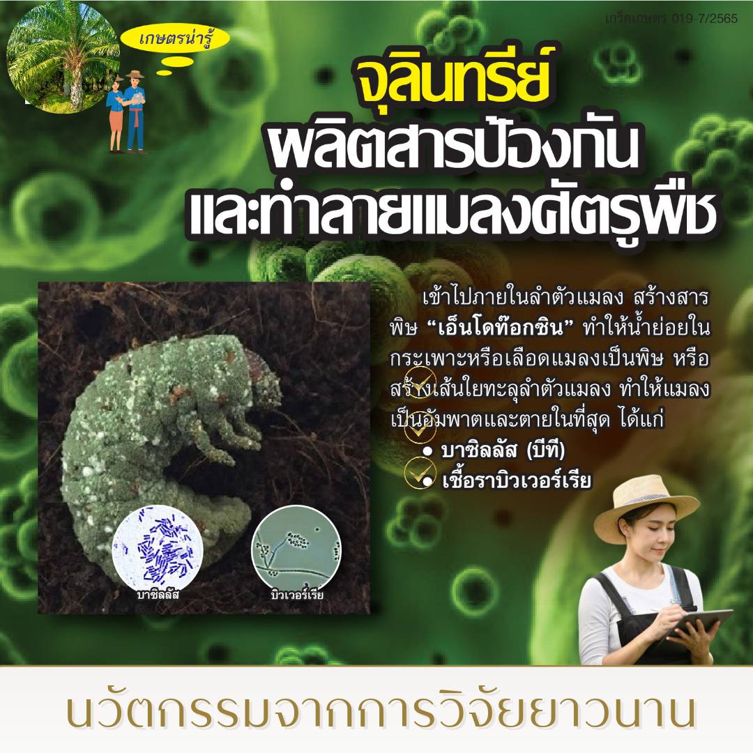 2) กลุ่มจุลินทรีย์ควบคุมแมลงศัตรูพืชเช่น เชื้อราบิวเวอเรียซึ่งมีประสิทธิภาพในการกำจัดเพลี้ยกระโดดสีน้ำตาล เพลี้ยจักจั่นต่างๆ เพลี้ยไฟ เพลี้ยอ่อน ไรแดง และแมลงหวี่ขาว หนอนห่อใบข้าว เป็นต้น การใช้บาซิลลัสทูรินจิเอ็นซิสกำจัดหนอนศัตรูพืช เช่น หนอนกระทู้ต่างๆ หนอนใยผัก