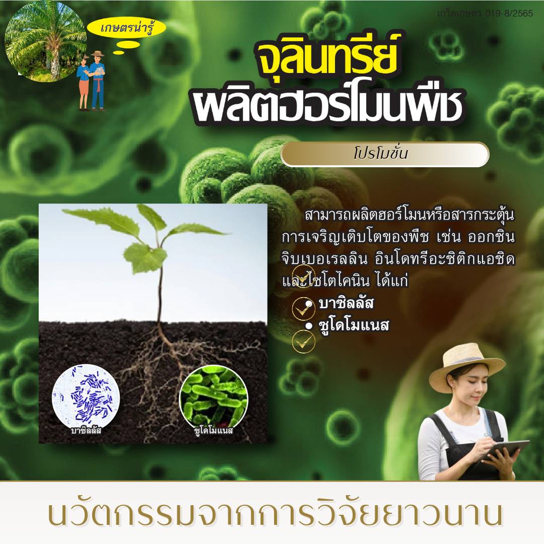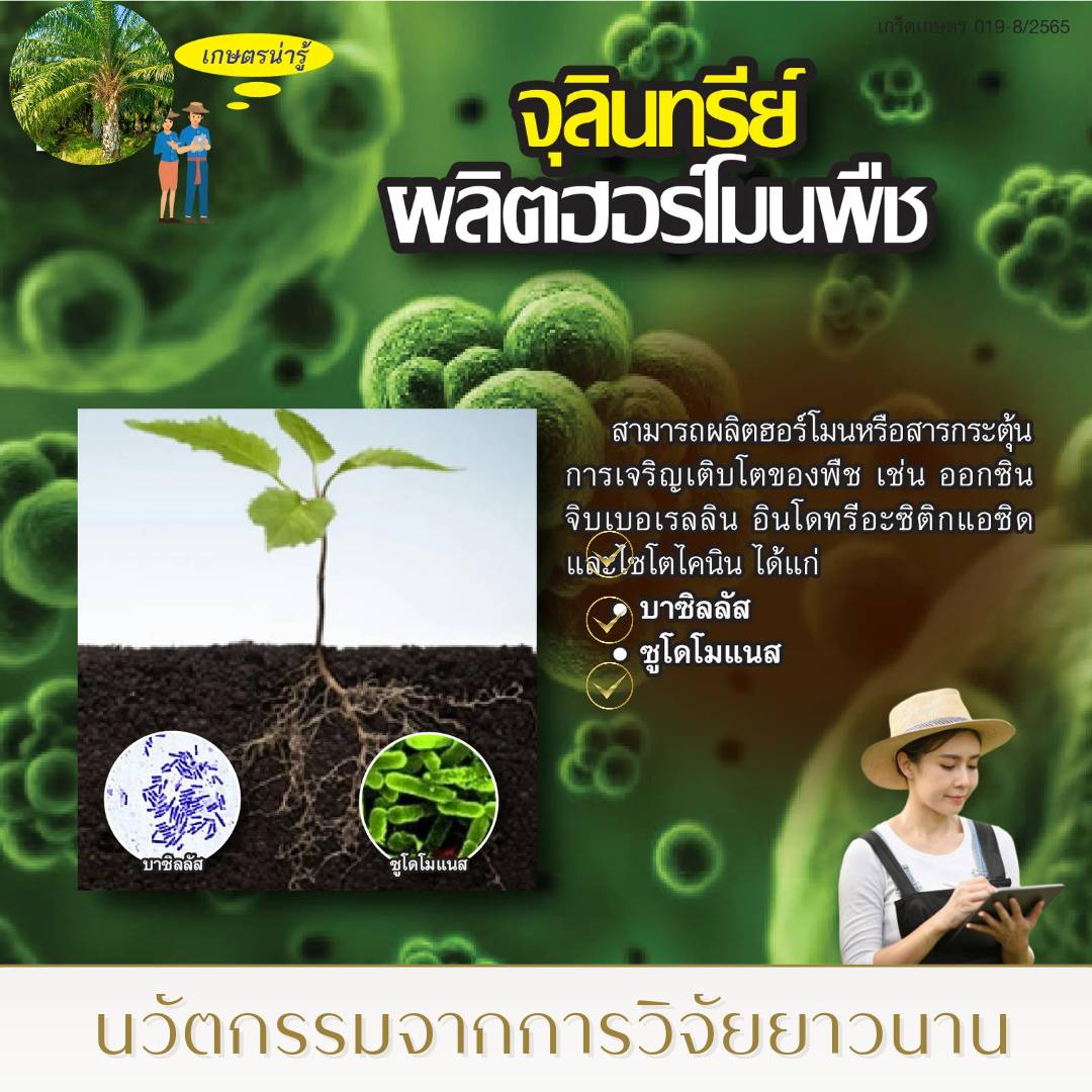 3. ส่งเสริมการเจริญเติบโตของพืช จุลินทรีย์สามารถผลิตฮอร์โมนออกซิน จิบเบอเรลลิน ไซโตไคนิน และกรดทริสโพริค ซึ่งมีลักษณะคล้ายกับกรดแอบซิสิค รวมทั้งวิตามินที่พบ เช่น ไธอามีน ไบโอติน กรดนิโคตินิค ไรโบฟลาวิน ไพริด๊อกซิน และเมทธิล โคบาลามิน ซึ่งเป็นสารที่ช่วยกระตุ้นให้พืชเจริญงอกงามดีขึ้น เช่น มีผลต่อการขยายขนาดของเซลล์ การเร่งเมล็ดให้งอก การก่อให้เนื้อเยื่อผลิตราก ช่วยการแบ่งเซลล์ของพืช ช่วยการออกดอก พัฒนาดอก และการเจริญของผลจนกระทั่งการแก่และสุก การชะลอความแก่ของใบ เพิ่มความต้านทานต่อสภาวะไม่เหมาะสมของพืช และช่วยรักษาสมดุลของการเจริญเติบโต